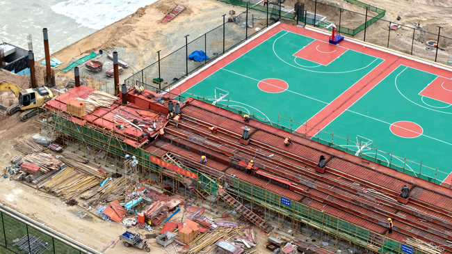 2月26日,俯瞰市工人文化宫项目建设现场,工人正在开展足球场跑道施工、篮球场座椅施工。该项目计划今年4月份建成。