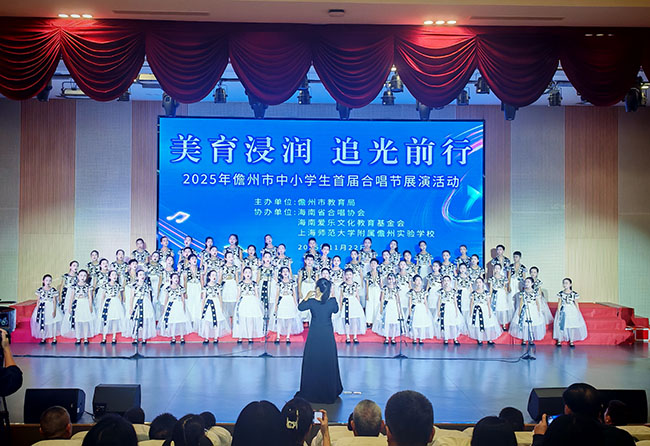 11月22日,由市教育局主办,以“美育浸润 追光前行”为主题的2025年儋州市中小学生首届合唱节展演活动在上海师范大学附属儋州实验学校举行。来自那大第一小学、市第一中学等29所学校共30支合唱队伍参加活动,并分为小学组、中学组展开激烈角逐。