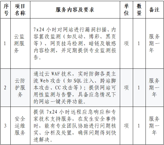 本项目旨在为儋州广播电视台官方网站(及相关网络平台)提供全面的网络安全监测与防护服务,保障儋州广播电视台网络宣传阵地的安全、稳定运行,防范黑客攻击、页面篡改、数据泄露等网络安全风险。服务期限为一年。